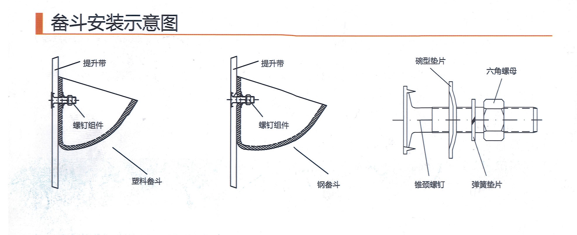 4、胶带式提升机应先在头部连接好后再装料斗,但不要连续装,因为那样盘车将会越来越费力。可以间隔装斗,尽量使上升段和下降段料斗数接近相等。料斗螺母必须拧紧。