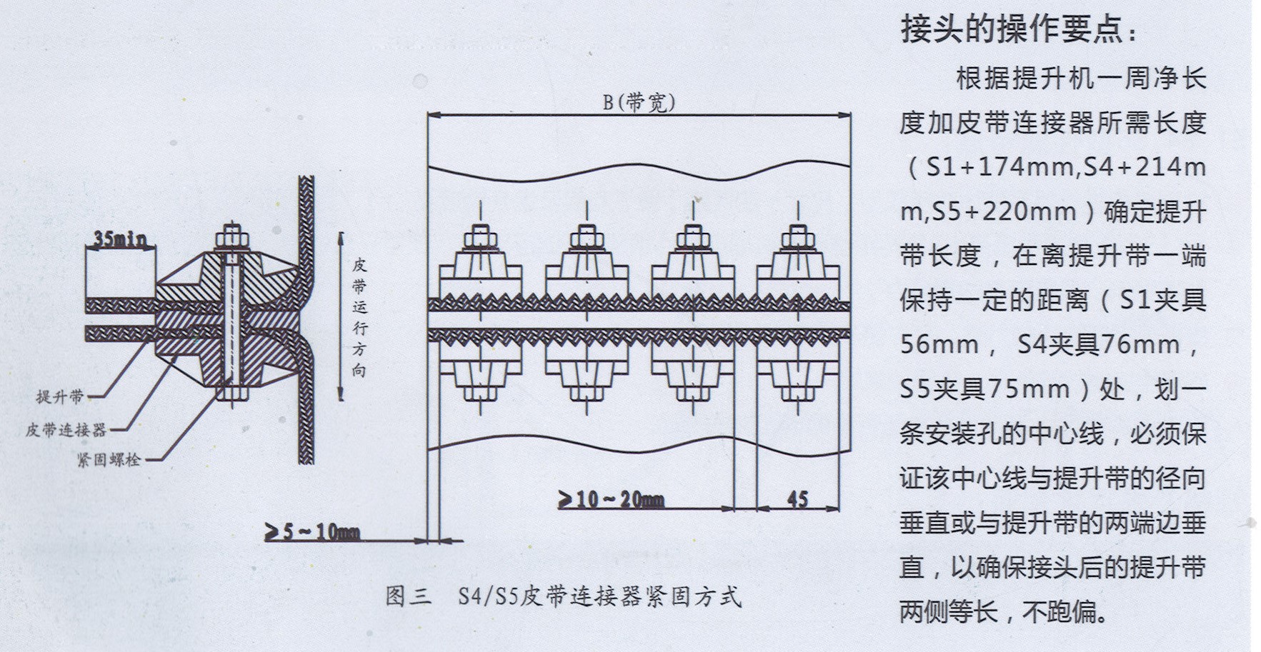 TD型带式提升机提升带与料斗的安装具体操作方法如下:
